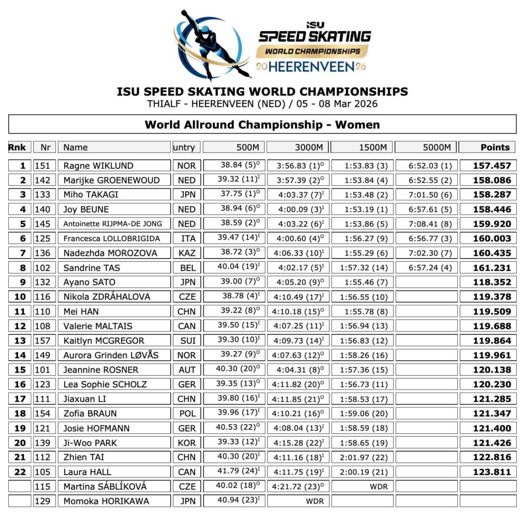 <女子オールラウンド> 2026.3.8 ISU 世界オールラウンド&スプリントスピードスケート選手権 2026
